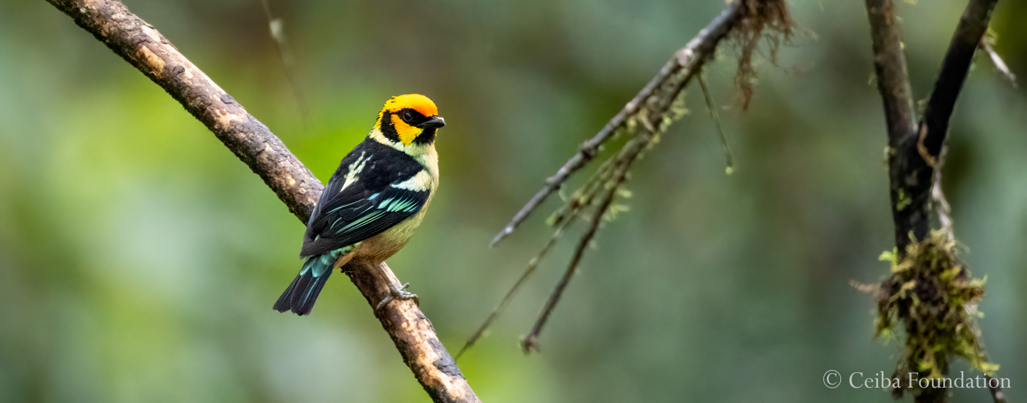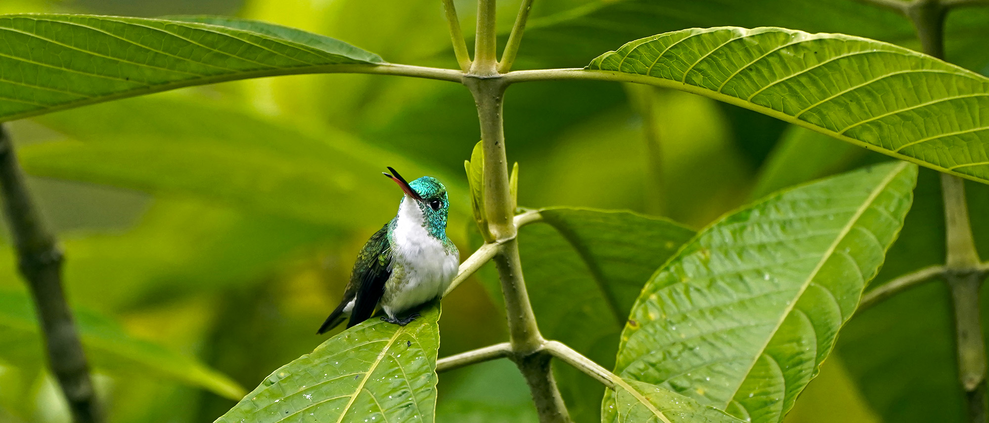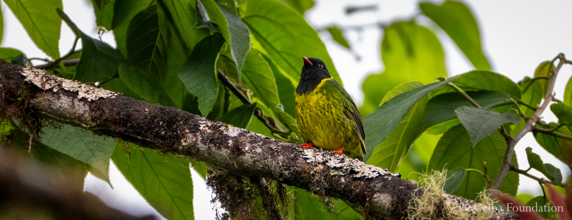 While we watched the tanagers feed, an eagle-eyed student caught a glimpse of green and gold in the trees, and there we found a rare denizen of the cloud forest, a Scaled Fruiteater perched quietly and showing off his coral-colored feet:
