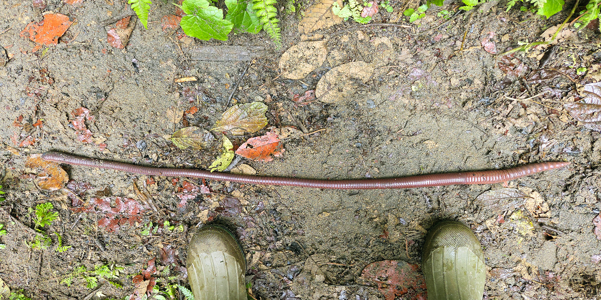 After measuring its length -- a whopping 4 feet! -- the worm got enthusiastic and started chasing us. Well, slowly enough not to be very frightening, in fact it's kind of adorable (perhaps only to a vermeologist):